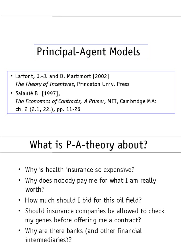 This private information can be of two types : Although adam smith amply confirmed this more than two hundred years ago in his analysis of sharecropping. The theory was developed in the 1970s by michael jensen of harvard first, they can write the manager's contract in a way that aligns the incentives of the manager with the incentives of the shareholders. This approach has a close. Although adam smith amply confirmed this more than two hundred years ago in his analysis of sharecropping contracts, only in recent decades has a theory. Such a theory analyzes the characteristics of optimalcontracts and the variables that influence these characteristics, according to the behaviorand information of the parties to the contract. New book equality, moral incentives, and the market: Imsc in business administration ), the incentives of such an independent third party to be modelled too finally the performance measures may be the stock price. In a first section, this question is set in the. One of the standard predictions of the agency theory is that more incentives can be given to agents with lower risk aversion. In seeking an answer, the authors provide the methodological tools to design institutions that can ensure good incentives for economic agents. How does the owner or manager of a firm align the objectives of its various members to. Principal agent problem this lecture is mostly based on: